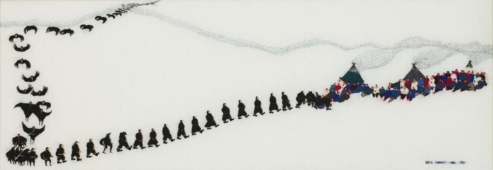 Seit Beginn ihrer künstlerischen Arbeit bildet das Sticken ihre Praxis. Mit Nadel und Faden übersetzt Britta Marakatt-Labba ihren Lebensraum in Bilder. Ihre Motive findet die Künstlerin in der Natur, dem Alltag der Sámi, ihrer Mythologie, doch ebenso im beständigen Widerstand gegen die kapitalistische Ausbeutung von Mensch, Tier und Landschaft. Das Arbeiten mit der Nadel erfordert Ruhe, Ausdauer und ein enormes technisches Geschick. Tausende von Stichen formen sich zu Landschaften und Erzählungen über eine verletzliche Welt und deren Bewohnende.